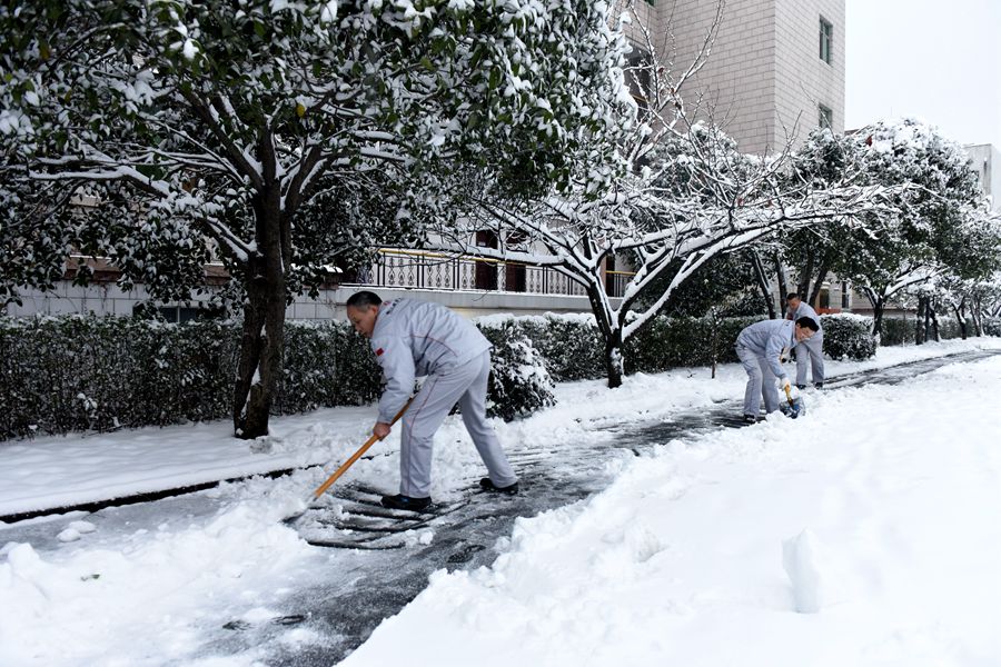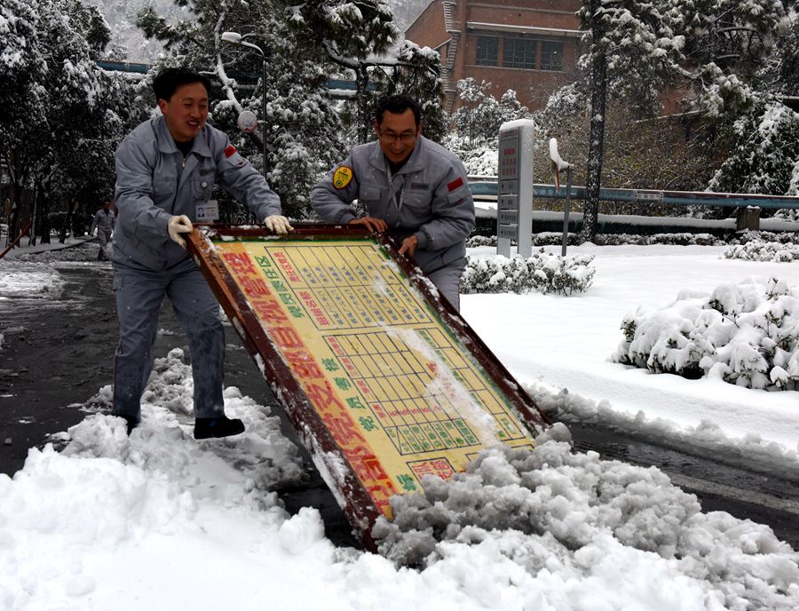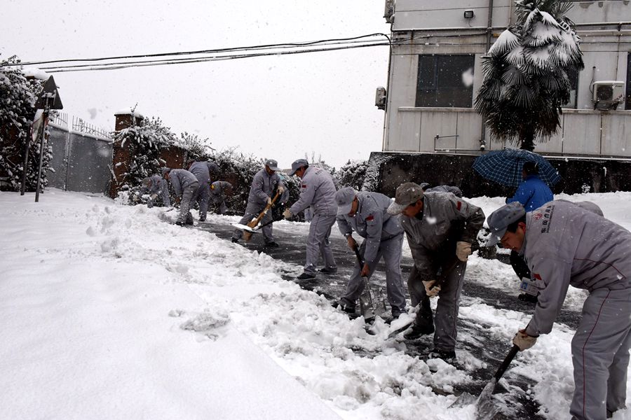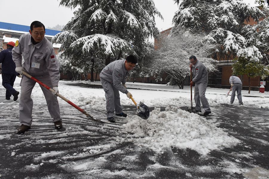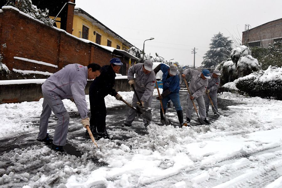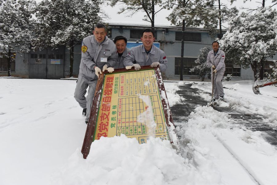 接到短信的鍛造員工,急匆匆從各方趕來。鍛造公司總經(jīng)理張朝敏來了,黨委書記張乾來了,副總經(jīng)理張兆德來了,總經(jīng)理助理朱家剛來了,綠化班的師傅來了,作業(yè)部的師傅們也來了……一路艱辛,一路跋涉,顧不上欣賞雪中美景,顧不上抖去身上的雪塵,紛紛趕到廠里參加除雪活動。