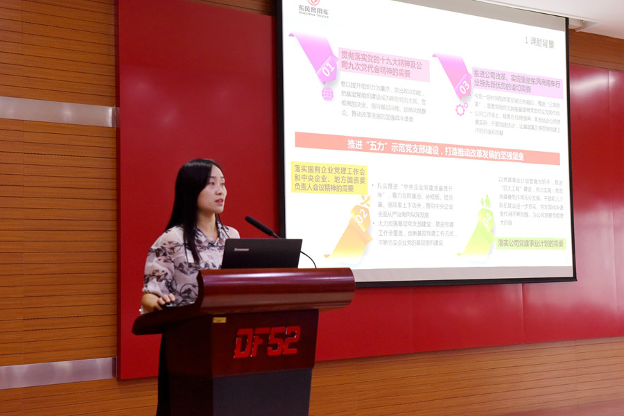 會上,組織宣傳科科長李雪燕代表課題組匯報了《“五力”示范黨支部建設(shè)》的選題背景、課題目標(biāo)、推進(jìn)組織機(jī)構(gòu)、推進(jìn)原則、課題方向、關(guān)鍵行動、行動計劃分解及課題推進(jìn)情況和取得的成果。據(jù)了解,該課題是東風(fēng)商用車公司基于貫徹落實(shí)黨的十九大精神及東風(fēng)公司九次黨代會精神的需要、落實(shí)國有企業(yè)黨建工作會和中央企業(yè)、地方國資委負(fù)責(zé)人會議精神的需要、推進(jìn)公司改革、實(shí)現(xiàn)重塑東風(fēng)商用車行業(yè)領(lǐng)先新優(yōu)勢的迫切需要、落實(shí)公司黨建事業(yè)計劃的需要而選立的,也是東風(fēng)商用車公司努力打造黨建工作特色品牌,致力提升黨建工作質(zhì)量和經(jīng)營融合度、貢獻(xiàn)度的有效舉措。據(jù)悉,“五力”就是突出政治引領(lǐng)力、組織保障力、推動發(fā)展力、宣傳發(fā)動力、凝聚服務(wù)力。東風(fēng)商用車公司推進(jìn)《“五力”示范黨支部建設(shè)》以來,已取得了階段性成果:明確了“五力” 黨支部創(chuàng)建辦法,出臺了“五力”黨支部評價細(xì)則;編印了《“五力”黨支部創(chuàng)建指南》,完成了示范支部申報;啟動開展?fàn)幾觥八膬?yōu)”黨員活動,制定發(fā)布了《黨員“積分制”指導(dǎo)評價細(xì)則;明確了下一步行動方向。